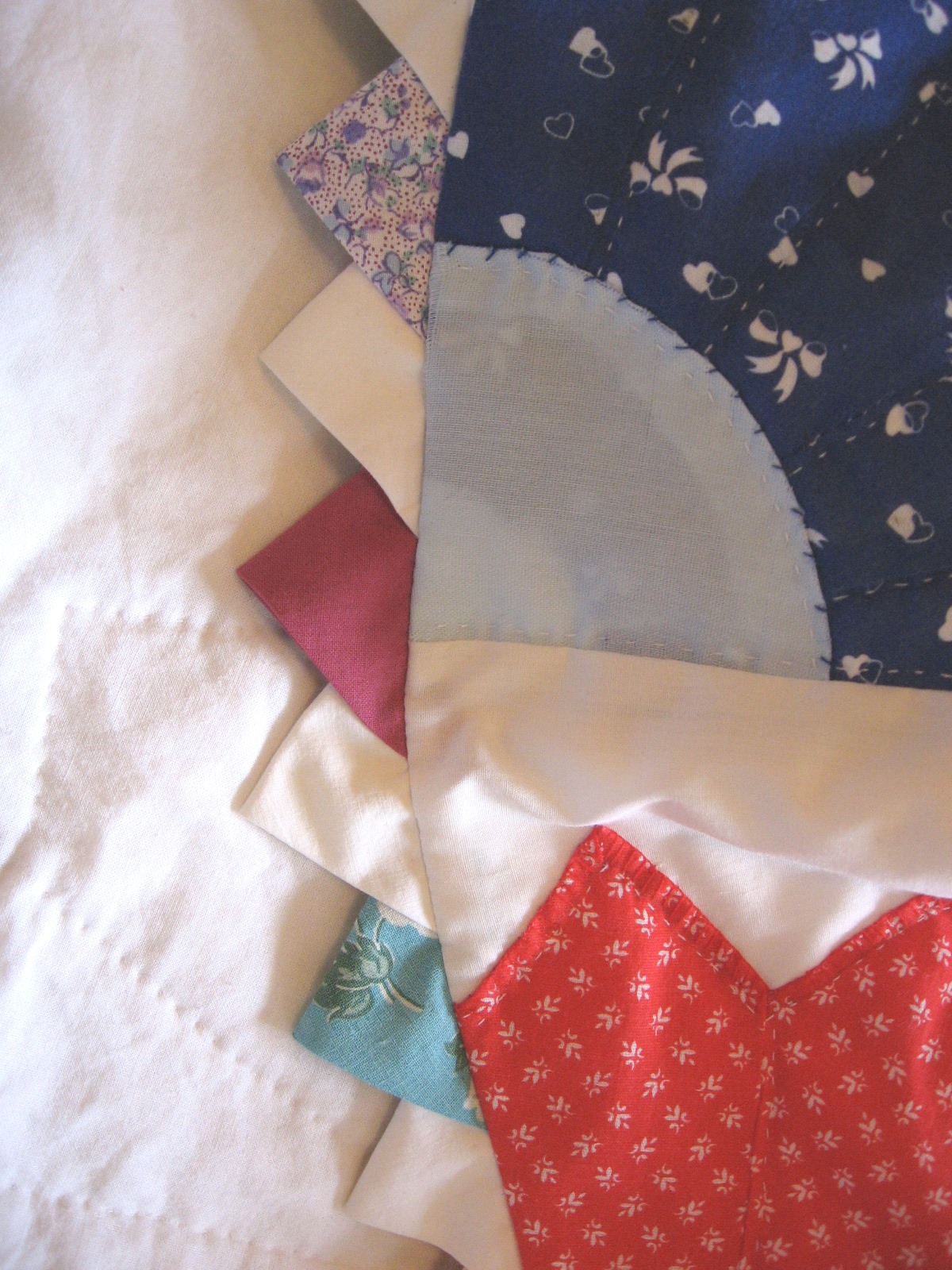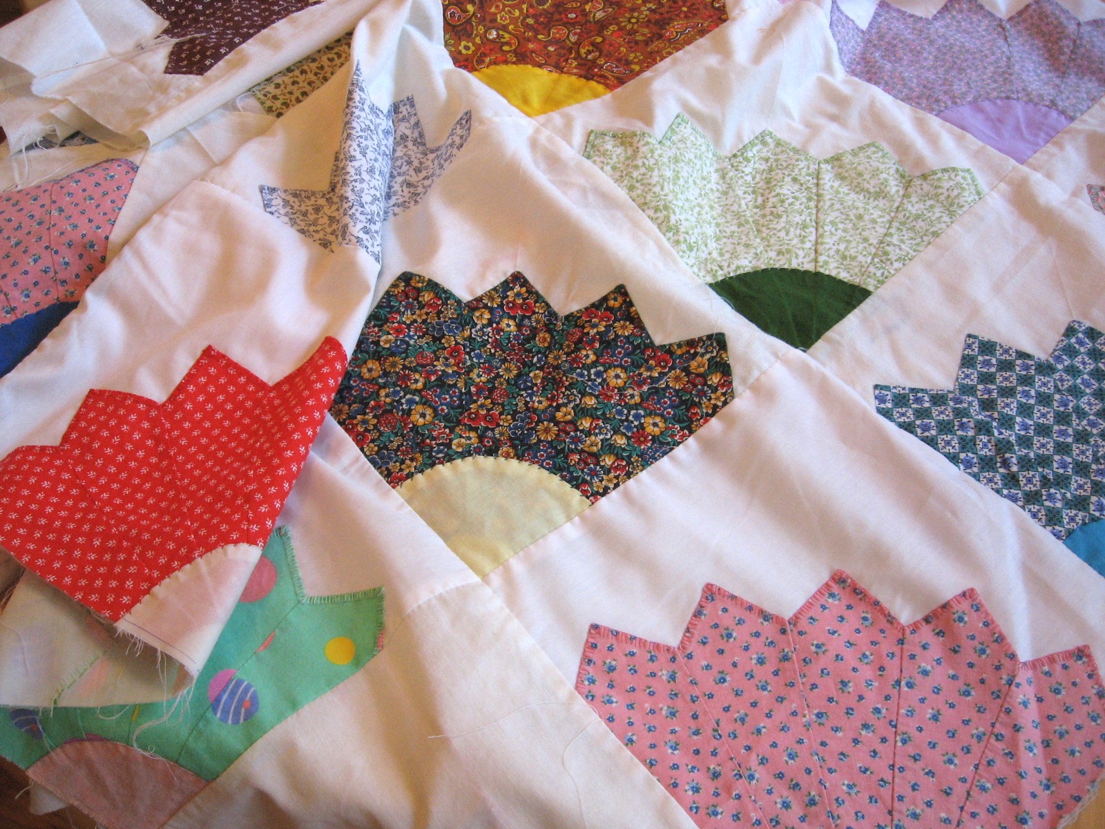 This fan quilt was in pretty bad shape, but I loved the feedsack fabric so much I had to grab a picture of one of the fans that looked good.