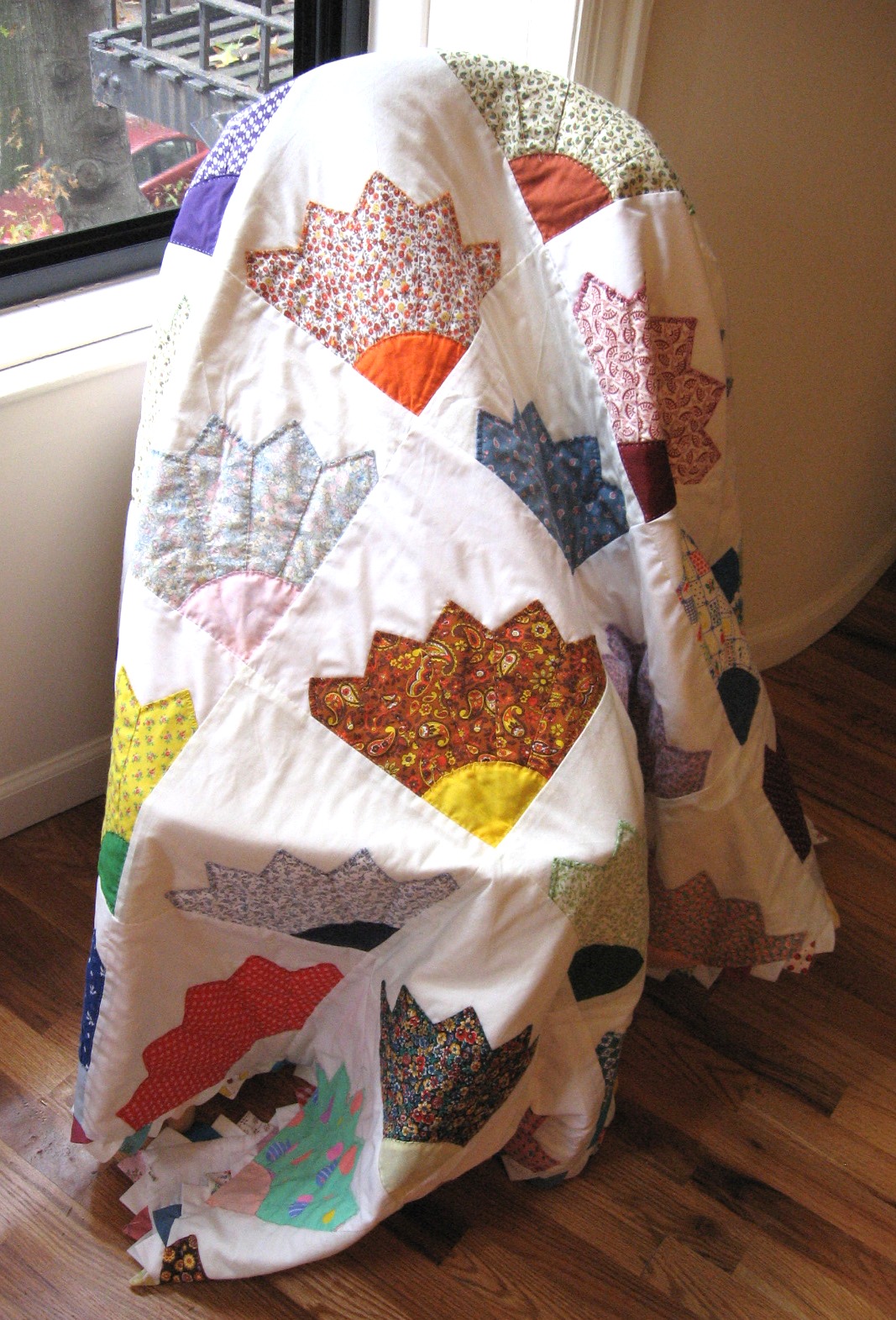 This is a quilt I can only take about 50 percent credit for; the other 50 percent goes to my grandma.  Years ago she made the quilt top and I took it over and finished it last week.  This design is part classic Dresden Plate quilt pattern, but with a twist.  I think they look more like fans so that’s what I’m calling it.