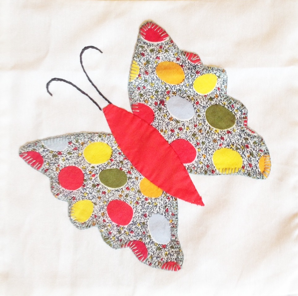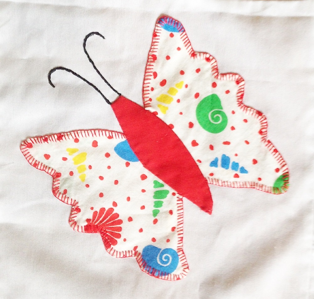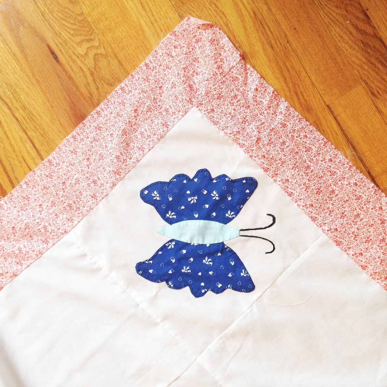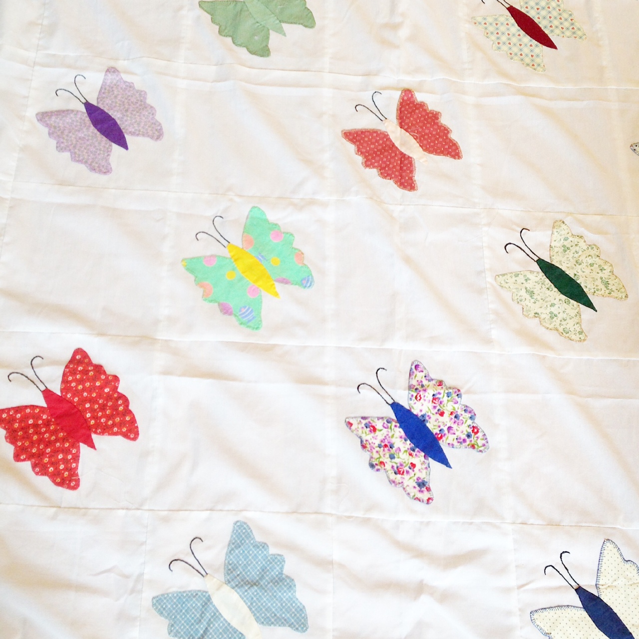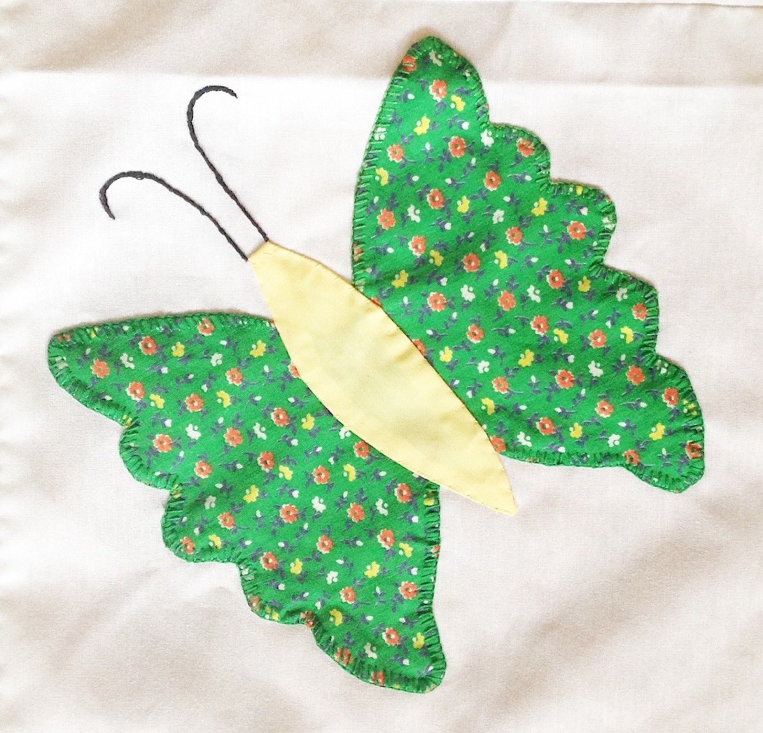 Way back in January, I posted about an applique butterfly quilt top my (almost 93-year-old) grandma made many years ago. She can’t quite remember when she made it, but we guestimate it is at least 20 years old, if not 30+. Since grandma doesn’t quilt anymore, I took this one on to finish for her and I’m finally done.